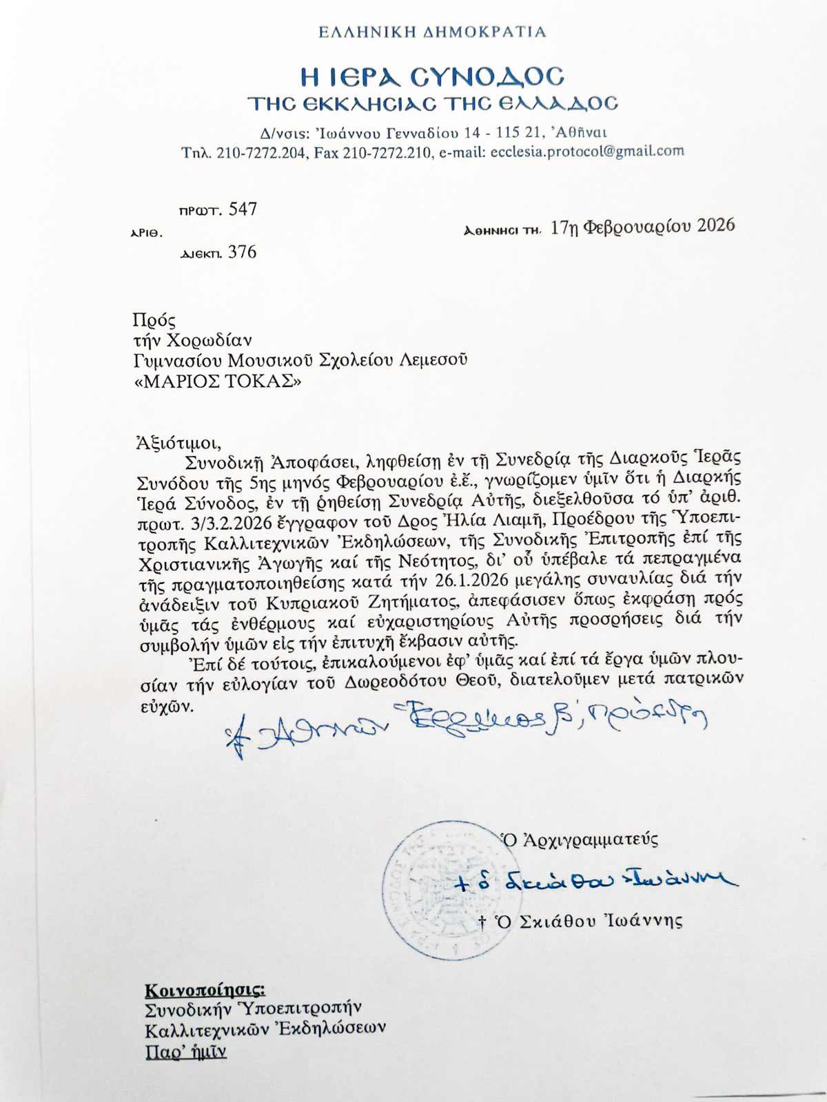 Ευχαριστούμε θερμά την ΙΕΡΑ ΣΥΝΟΔΟ ΤΗΣ ΕΚΚΛΗΣΙΑΣ ΤΗΣ ΕΛΛΑΔΟΣ, τον Πρόεδρο και τον Αρχιγραμματέα της Διαρκούς Ιεράς Συνόδου για την πιο κάτω ευχαριστήρια επιστολή που έλαβε σήμερα το σχολείο μας για τη συμμετοχή της Χορωδίας τού Μουσικού Γυμνασίου Λεμεσού «Μάριος Τόκας» στη συναυλία ΚΥΠΡΟΣ ΤΟΥ ΜΑΡΤΥΡΙΟΥ ΚΑΙ ΤΗΣ ΑΝΑΣΤΑΣΗΣ που πραγματοποιήθηκε στην Αθήνα στις 21 Ιανουαρίου 2026.